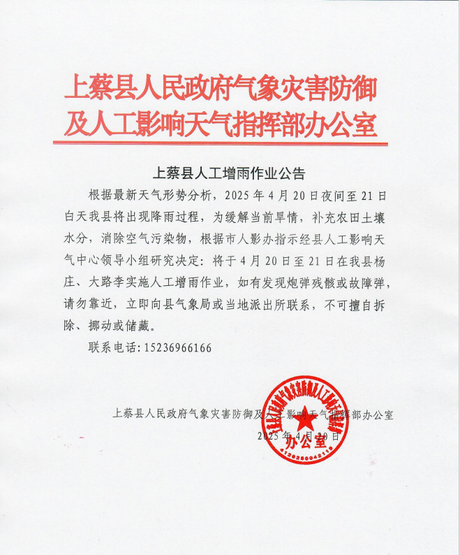 根据最新天气预报结果,4月20日夜间至21日白天,我县将出现有利于作业的天气条件,为切实增加降雨量、改善土壤墒情、降低森林火险等级,根据市人影办指示要求,西平县人民政府气象灾害防御及人工影响天气指挥部办公室研究决定:2025年4月20日夜间至21日白天在全县境内实施人工增雨作业。请居民不要近距离围观,发现不明降落物体请不要自行处理,立即报告西平县人民政府气象灾害防御及人工影响天气指挥部办公室。